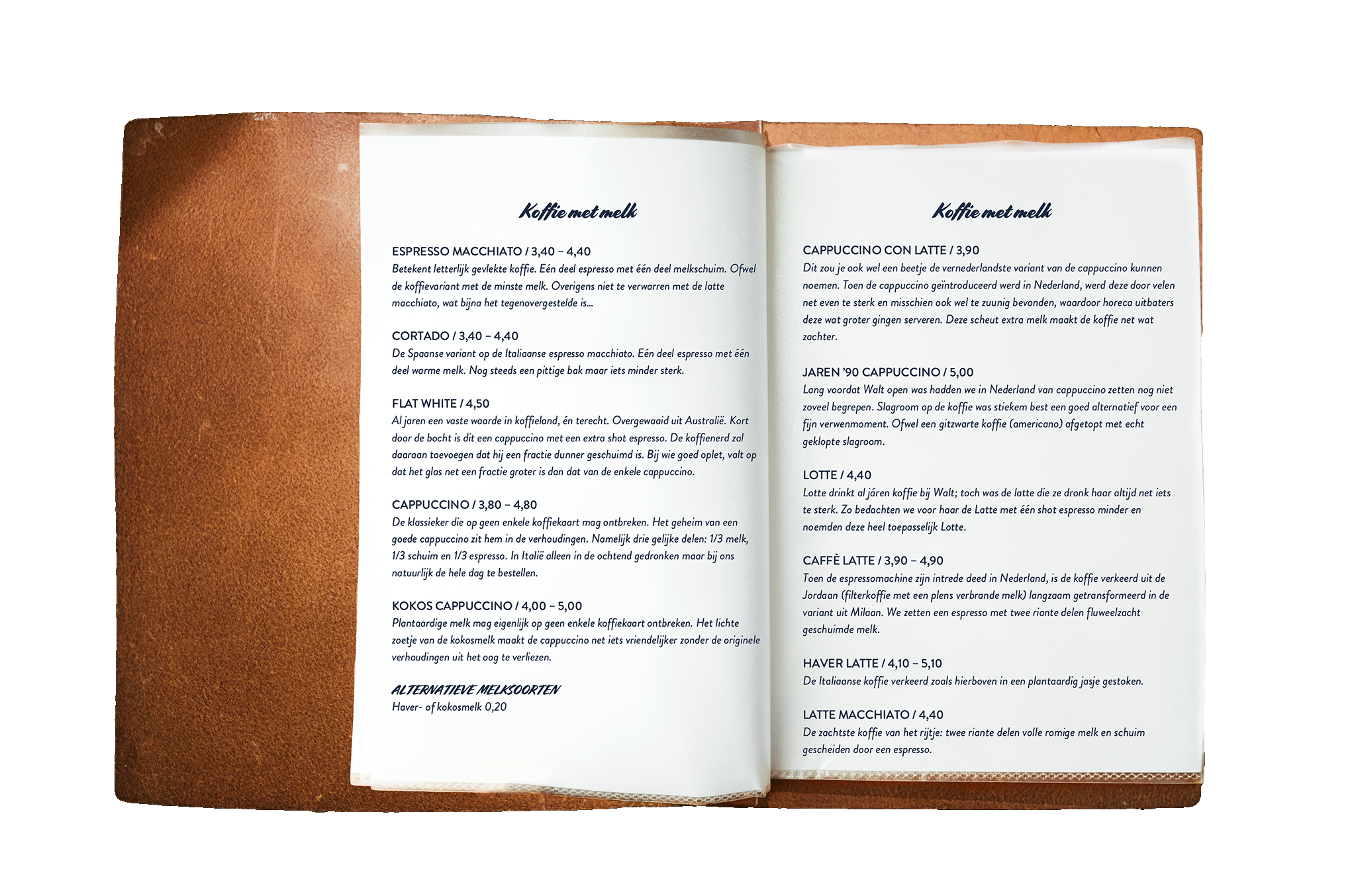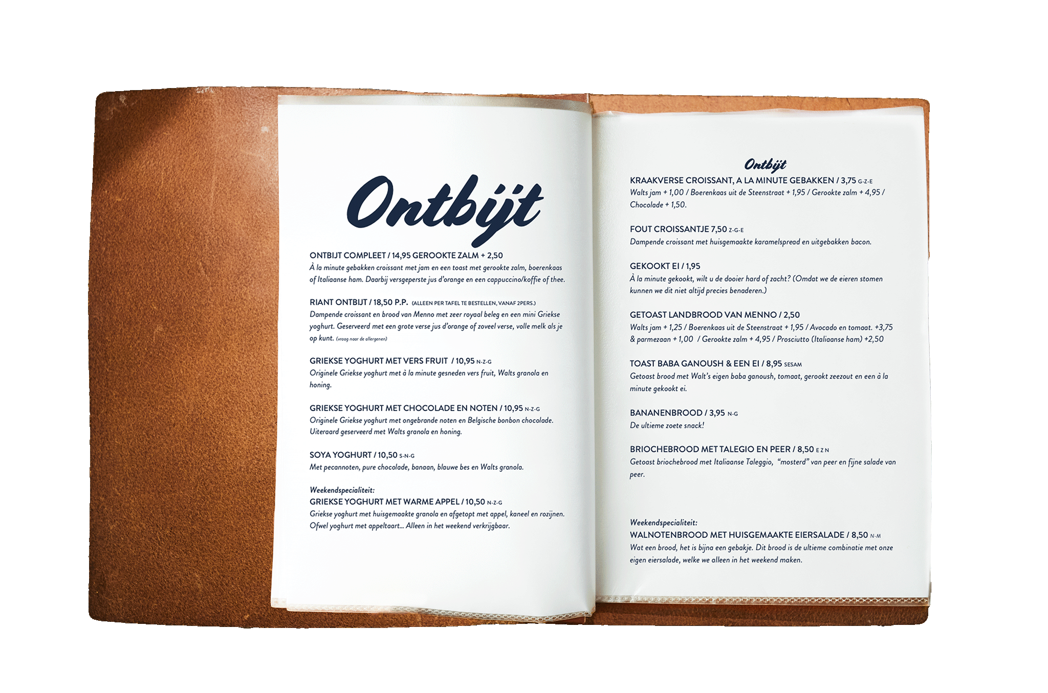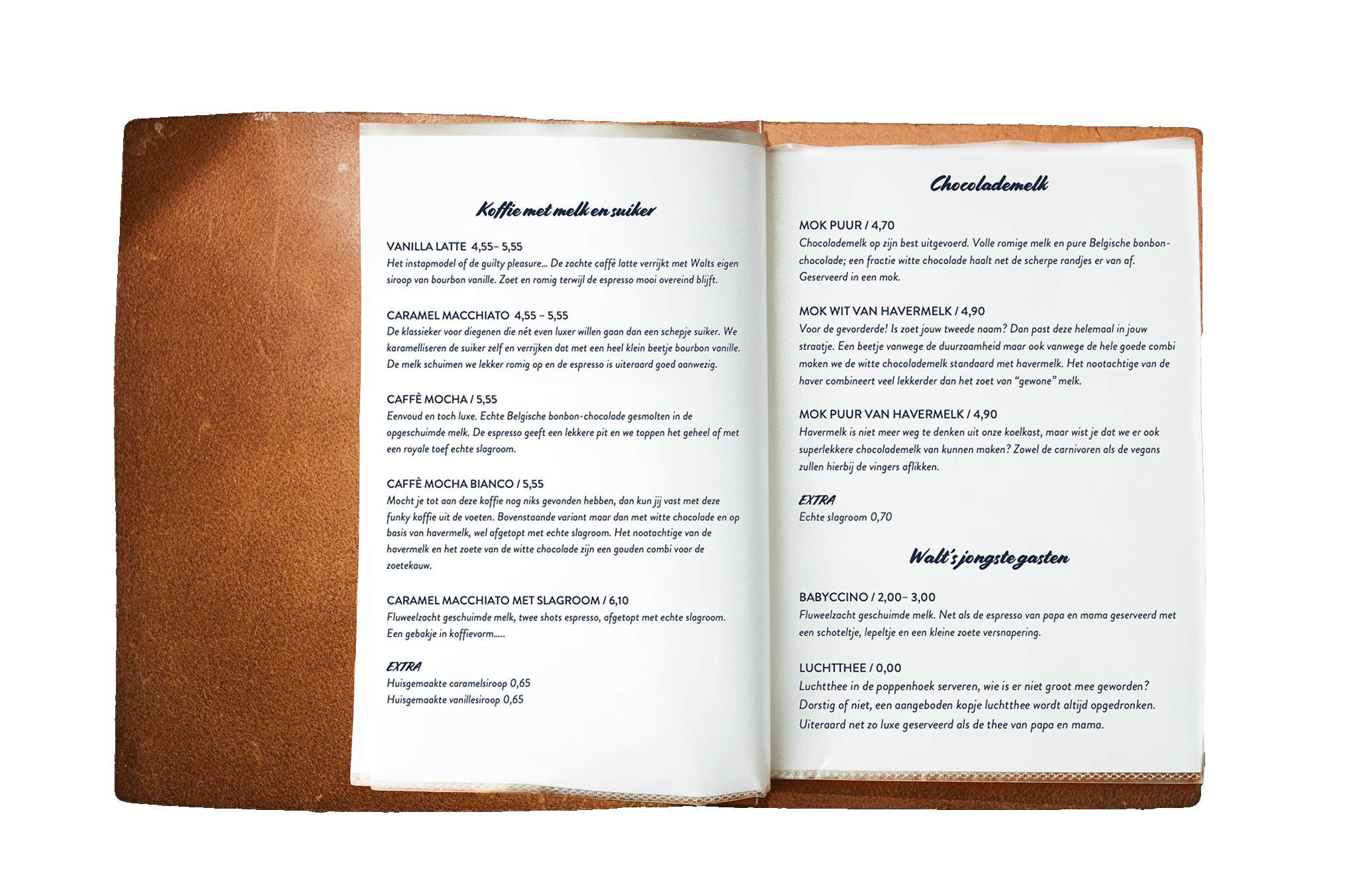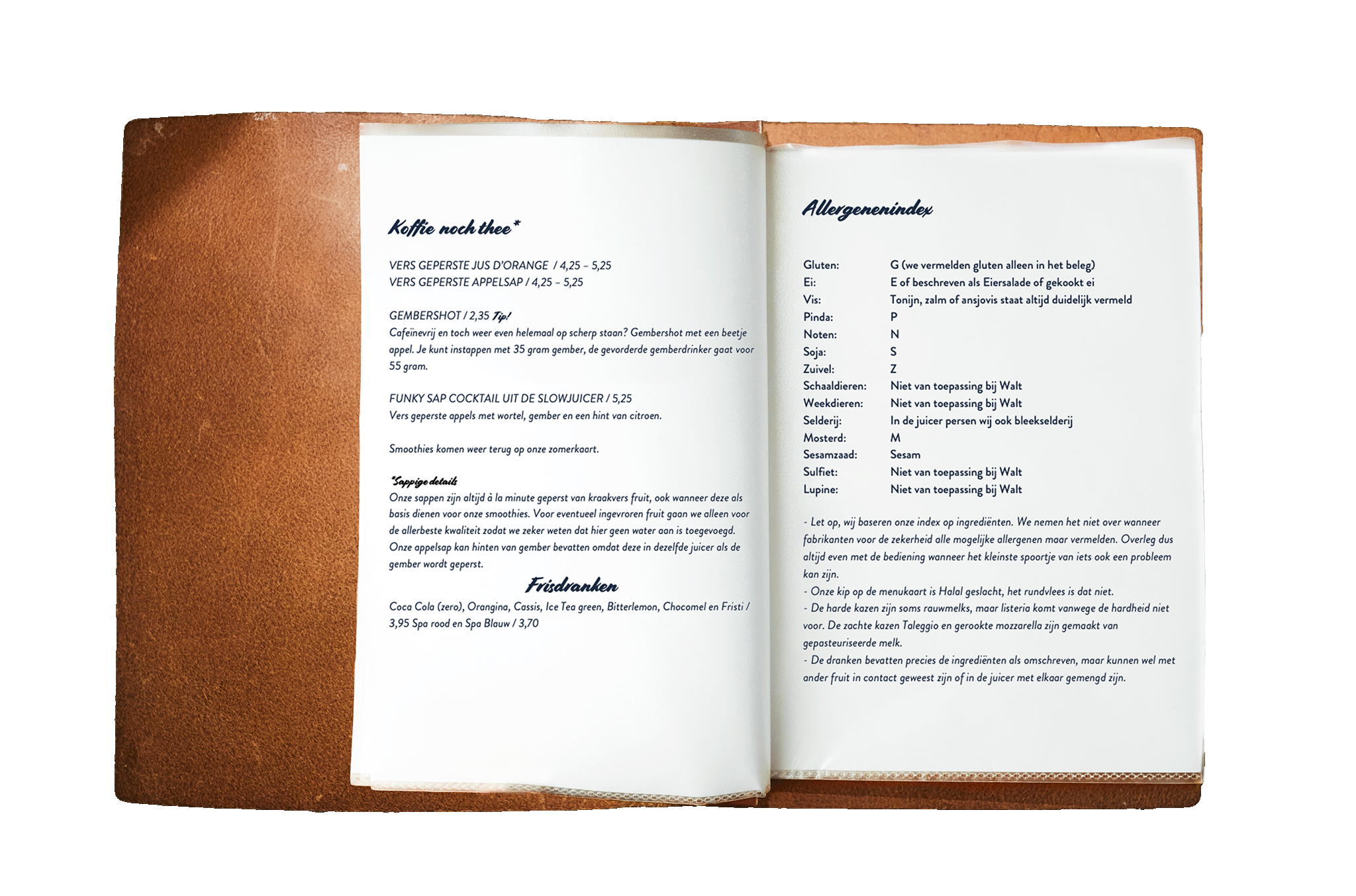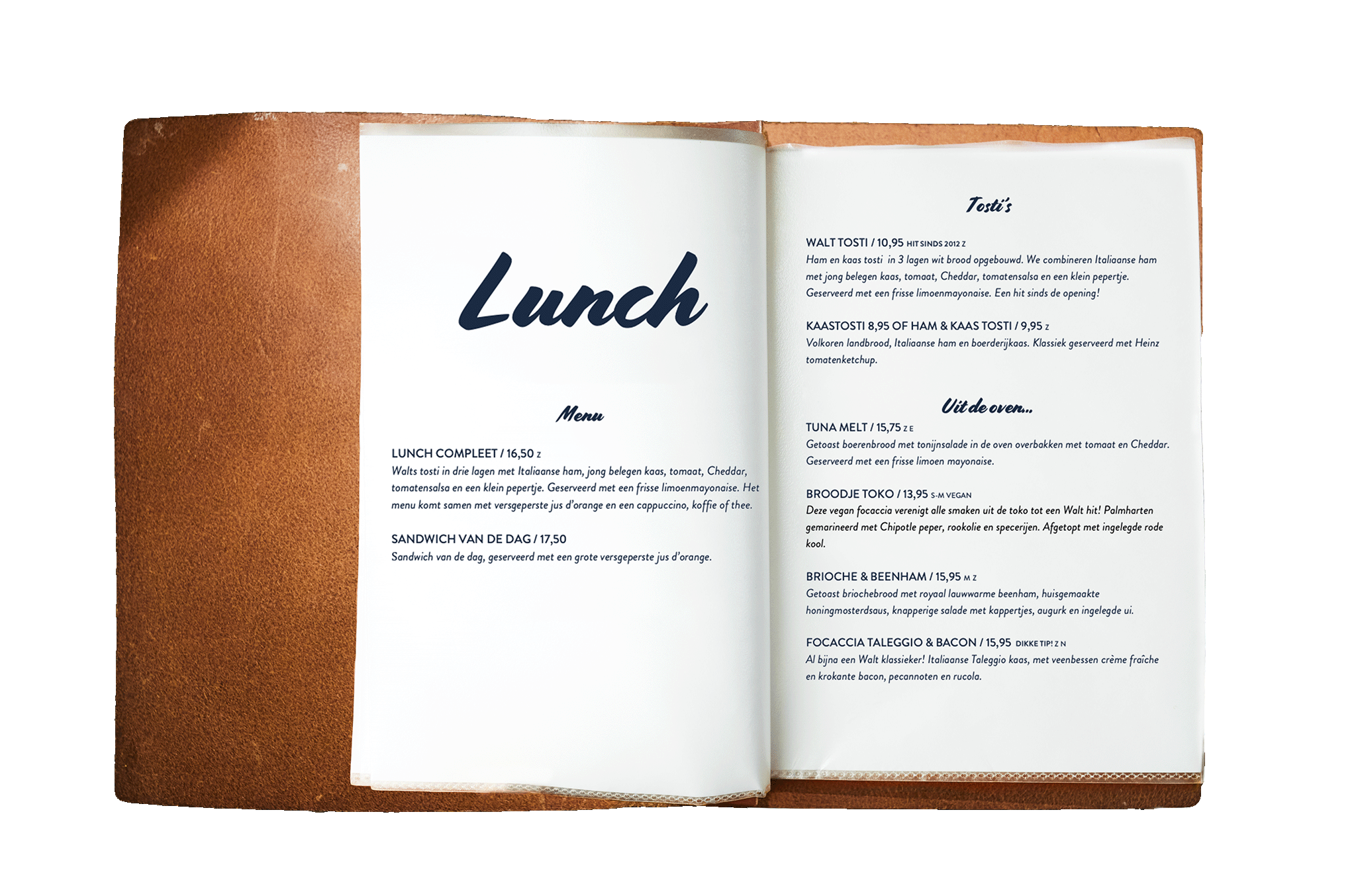 Bij Walt kun je met iedereen op de koffie komen. Met je werkgever die zo graag vlees eet maar ook met de liefde van je leven die onlangs vegan is geworden. Of je visite nu een glutenallergie heeft of juist graag met brownies ontbijt, wij hebben het in huis. Ook aan hen die geloven is gedacht doordat bijvoorbeeld de kip op de menukaart halal is geslacht.