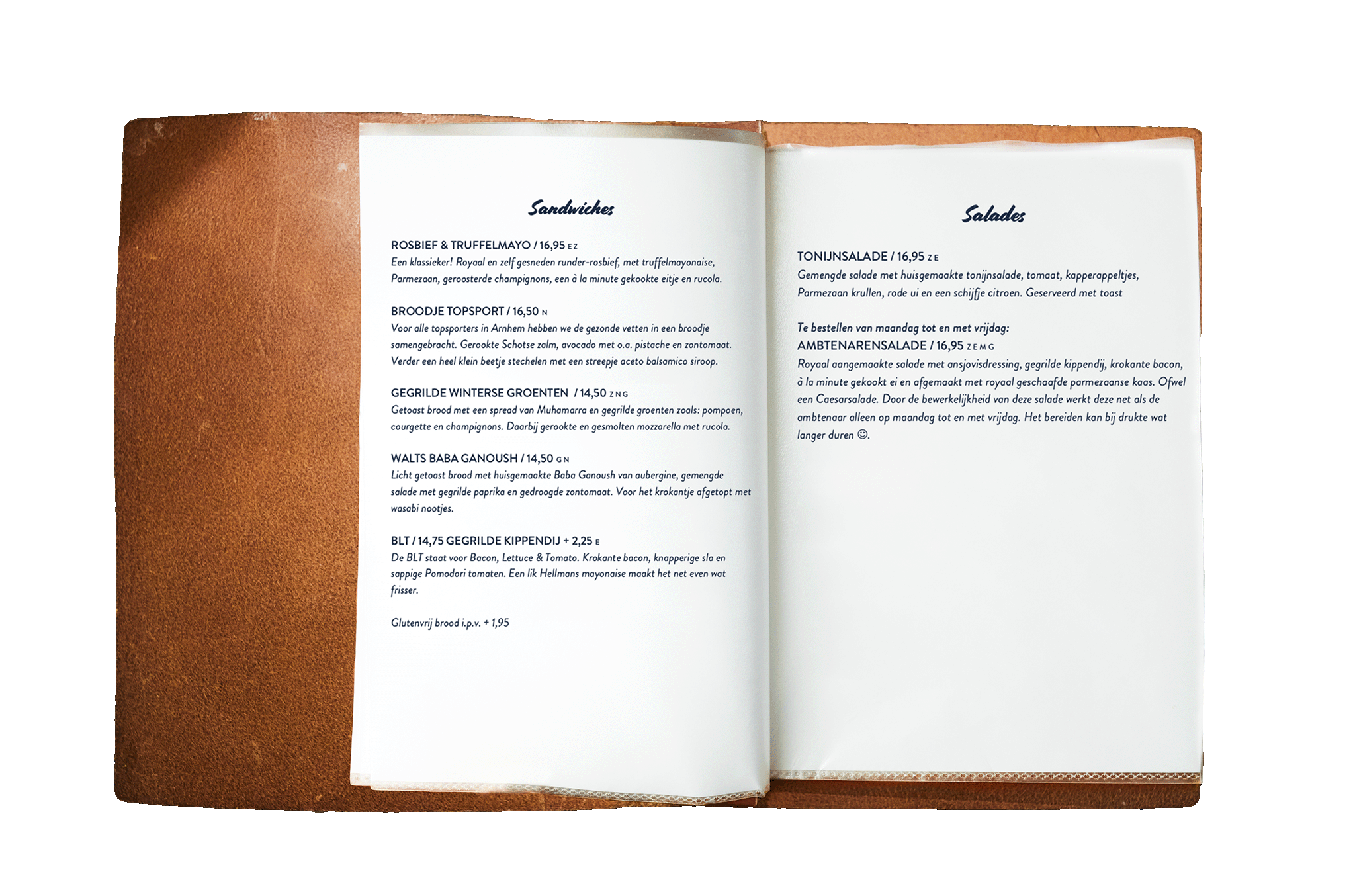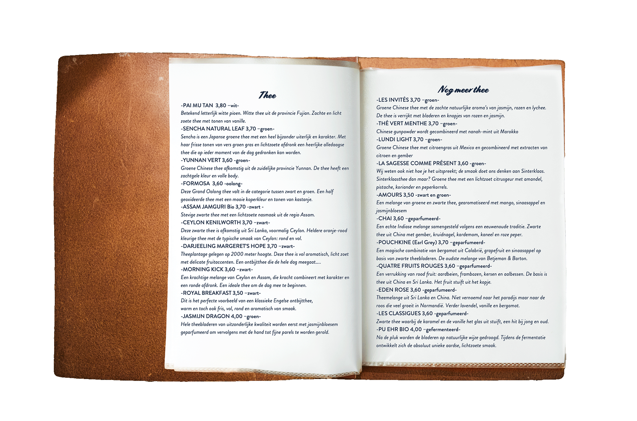 We zeggen wel eens gekscherend: wij hebben alles waar je geen afzuigkap voor nodig hebt. Dus wel een tuna melt overbakken in de oven maar geen uitsmijter, geen “twaalf uurtje’ maar wel een gestoomd eitje, geen biefstuk maar wel flinterdun gesneden carpaccio etc etc.