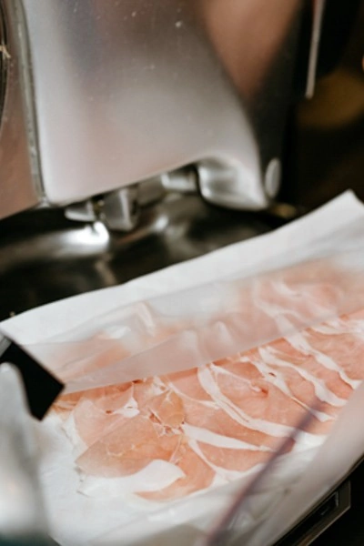 We halen regelmatig een andere mooie ham in huis, van Italië tot Spanje. Door onszelf flinterdun gesneden op de vroegere Berkel snijmachine, ooit failliet gegaan omdat deze machine’s nooit stuk gingen nadat de hele wereld er eentje gekocht had. Inmiddels heeft het bedrijf een doorstart gemaakt onder de naam Deko en zit het gevestigd in Arnhem. Leuk hé! Een portie is in ieder geval genoeg voor twee personen.